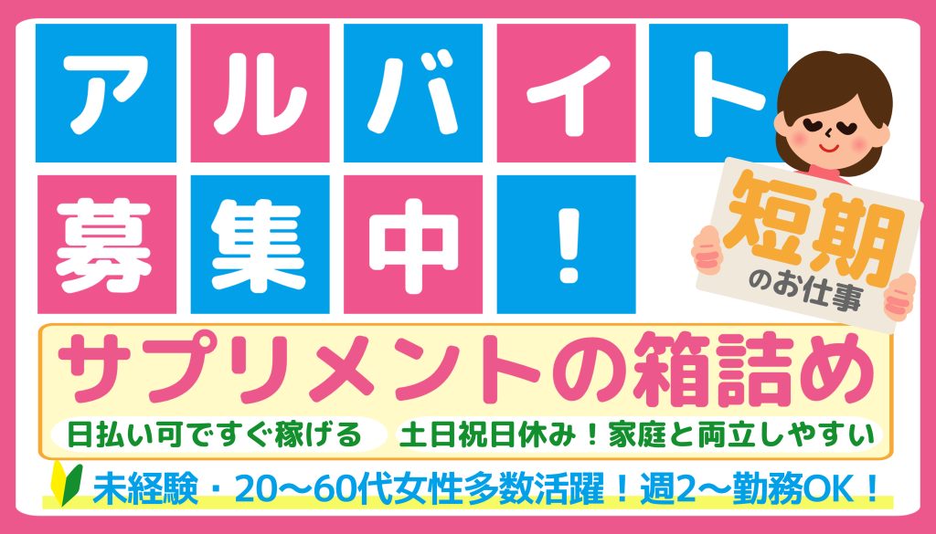 コンベアーで流れてくるサプリメントの印字や包装を目視して検品し、箱に詰める作業です。 未経験からでもすぐに始められるお仕事です。 |