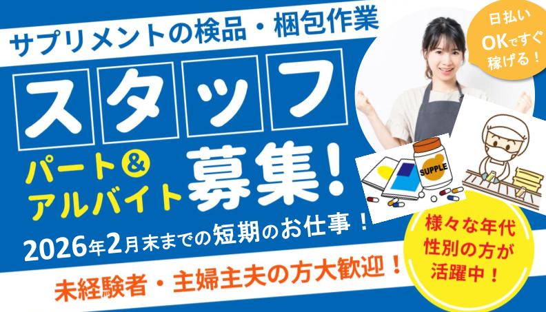 コンベアーで流れてくるサプリメントの印字や包装を目視して検品し、箱に詰める作業です。 未経験からでもすぐに始められるお仕事です。 |