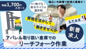 アパレルを取り扱う倉庫内でのリーチフォーク作業のお仕事。